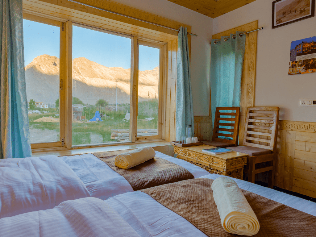 Nestled in the quiet village of Sumur in Nubra Valley, Nubra Eco Homestay offers a peek into everyday Ladakhi life, where the Karakoram mountains meet the calm Siachen River. About 6 hours from Leh, this village sits along the historic Silk Route, once traveled by traders and monks. The homestay is built with traditional Ladakhi materials and features wood carvings and local architecture, blending rustic charm with cozy comfort. Wake up to the sound of rustling poplar trees, stroll through Sumur’s fields and visit the 140-year-old Samstanling Monastery nearby.