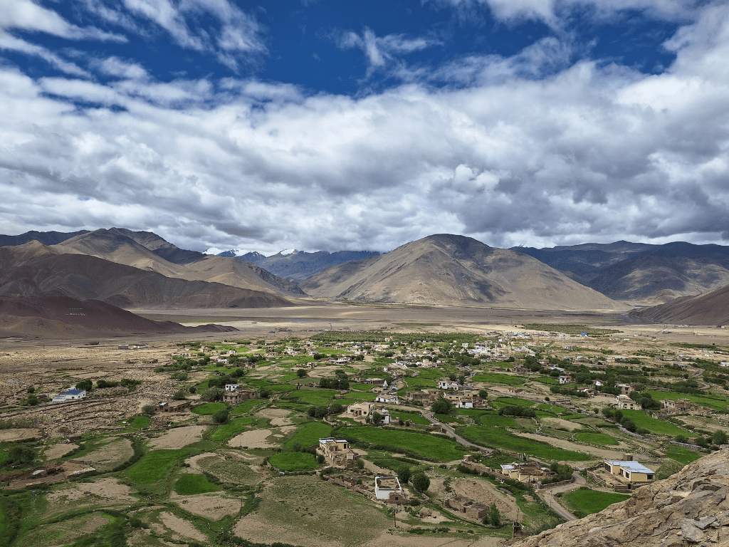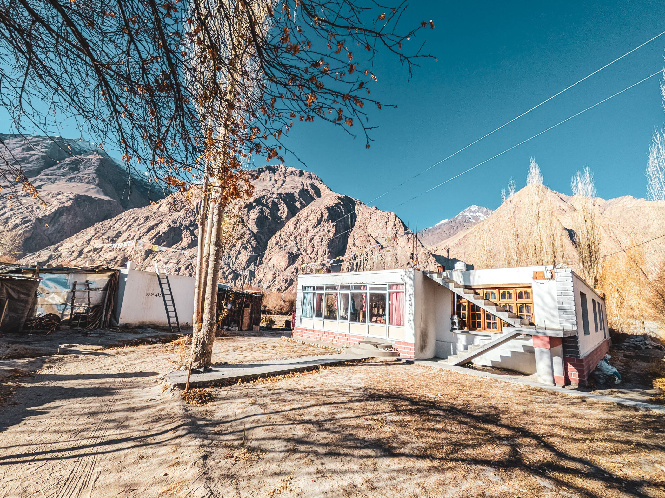 A homestay located in a remote village near the Siachen Glacier, surrounded by traditional farming fields and local community life
